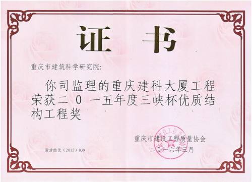 建科大厦工程获三峡杯优质结构工程奖