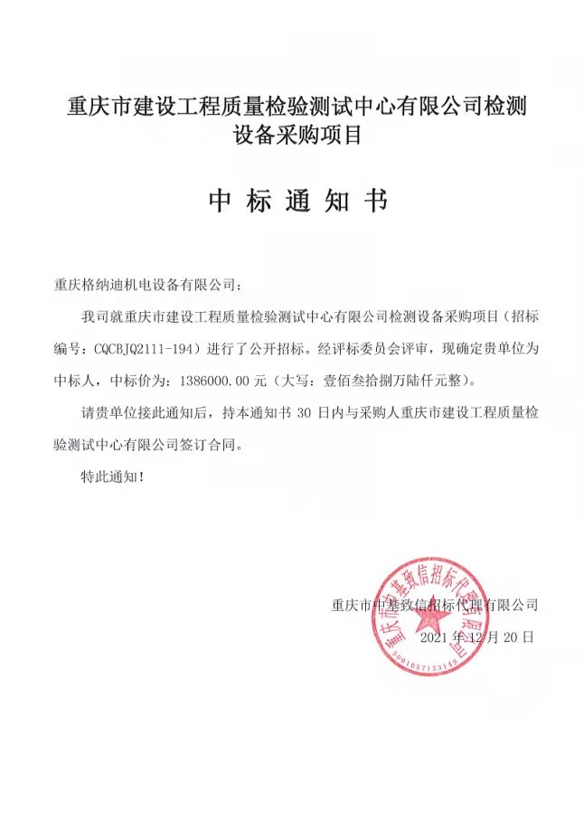 重庆市建设工程质量检验测试中心有限公司委托重庆市中基致信招标代理有限公司对我公司检测设备采购项目(项目号:CQCBJQ2111-194 )进行公开招标采购,现已完成全部采购程序,确认重庆格纳迪机电设备有限公司为中标人,中标价为1386000元(壹佰参拾捌万陆仟佰元整)。