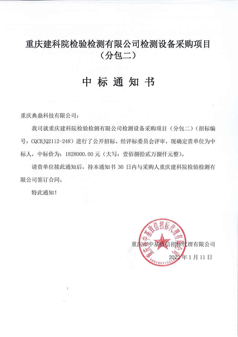 重庆建科院检验检测有限公司委托重庆市中基致信招标代理有限公司对我公司检测设备采购项目(项目号:CQCBJQ2112-248 )分包一(力学)和分包二(化学)进行了公开招标采购,现已完成全部采购程序。确认重庆展宇仪器设备有限公司为分包一(力学)中标人,中标价为2305000元(贰佰参拾万伍仟佰元整)。确认重庆典鼎科技有限公司为分包二(化学)中标人,中标价为1828000元(壹佰捌拾贰万捌仟元整)。