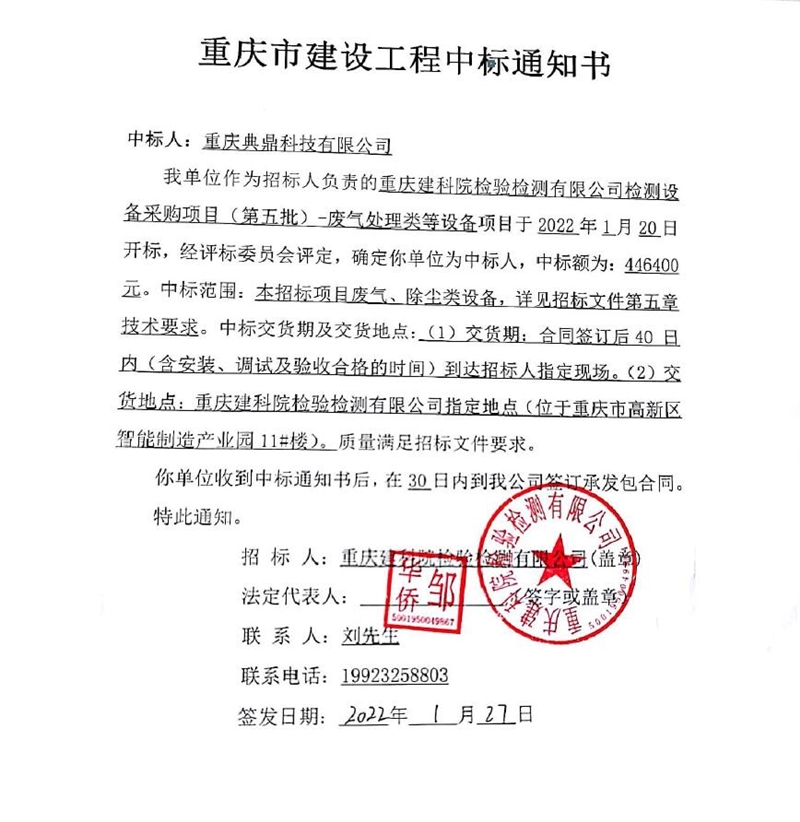 重庆建科院检验检测有限公司委托重庆市工程管理有限公司对我公司检测设备采购项目(项目号:CQEM-ZB-22002 )重庆建科院检验检测有限公司检测设备采购项目(第五批)-废气处理类等设备进行了公开招标采购,现已完成全部采购程序。确认重庆典鼎科技有限公司为检测设备采购项目(第五批)-废气处理类等设备采购项目中标人,中标价为446400元(大写:肆拾肆万陆仟肆佰元整)。