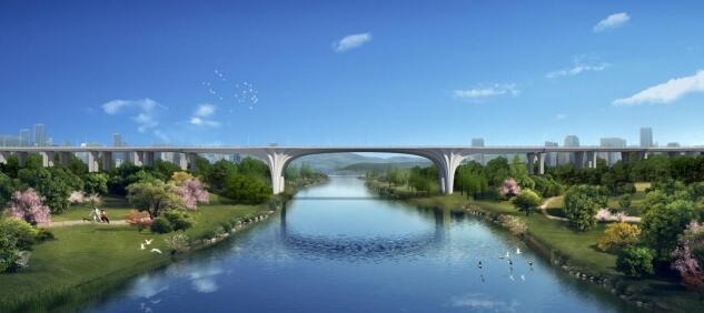 六横线御临河大桥位于重庆市两江新区龙兴工业园区内,为重庆市主城区规划“六横、七纵、一环、七联络”快速路网中六横线的关键性节点工程,也是主城区东部槽谷地带重要的东西向快速通道。该桥西起渝江路,跨越御临河,东至御复路,长约889m,设计标准为城市快速路,控制宽度39米,双向8车道。主桥为变截面连续刚构桥,桥墩采用空心薄壁墩,外挂贝壳状铝板景观结构,并与墩顶位置景观平台形成良好的景观融合。引桥下部结构采用花瓶墩,全桥以LED景观照明,外形新颖、色彩靓丽,与御临河两岸自然风光浑然一体,与周边城市景观相得益彰。