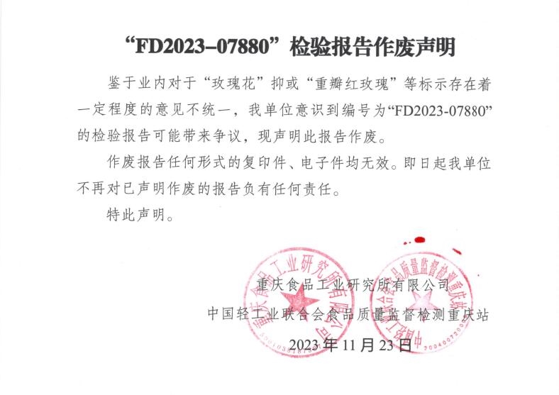 鉴于业内对于“玫瑰花”抑或“重瓣红玫瑰”等标示存在着一定程度的意见不统一,我单位意识到编号为“FD2023-07880”的检验报告可能带来争议,现声明此报告作废。
