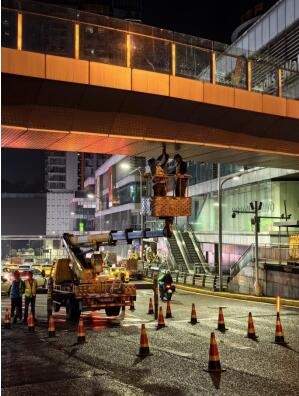 天桥位于商业区,天桥上下人流、车流量较大,且天桥外侧加装了铝板装饰层,无形中为现场检测工作带来了难度。为尽快完成本次检测,同时减少现场检测工作给游客及交通带来的影响,本次检测选择在夜晚进行。我司组织了在检测、鉴定领域具有丰富经验的专家及检测人员进驻现场,在最短时间完成了检测方案编写、天桥计算分析、交通占道方案审批、现场检测工作准备以及桥梁外观检查、静载和动载试验以及栏杆推力试验,圆满完成检测任务,为天桥结构的安全提供了有力的技术保障,为桥上打卡游客的人身安全保驾护航。