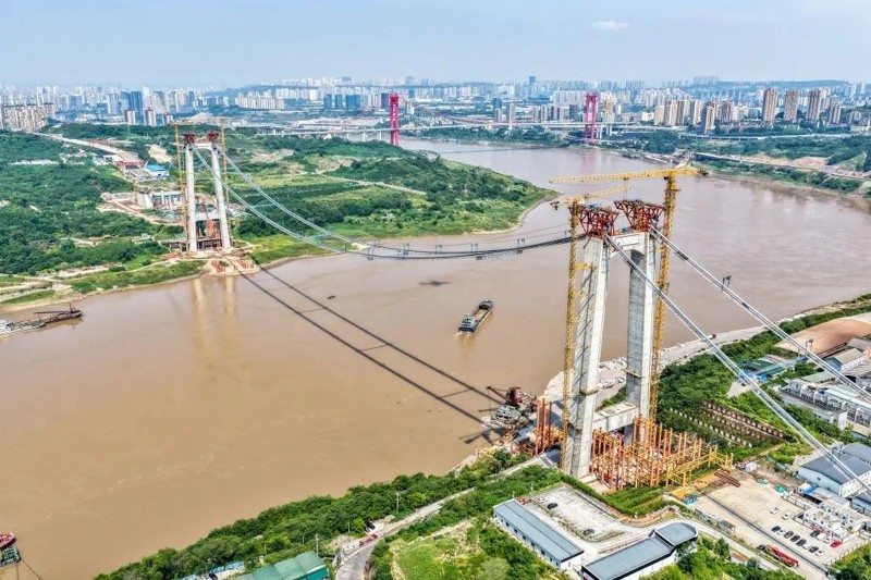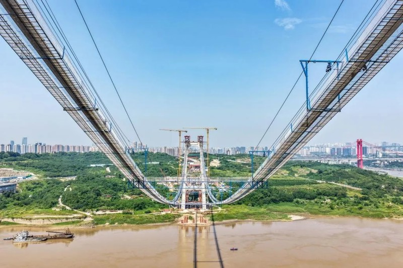 黄桷沱长江大桥全长1260米,主跨765米,采用单跨悬吊双塔三跨连续钢桁梁悬索桥桥型一跨过江,成为在建世界最大跨径公轨两用悬索桥。