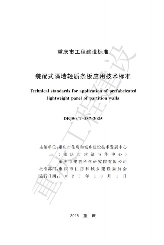 近日,由重庆设计集团所属子企业如意彩(以下简称“如意彩”)联合重庆市住房和城乡建设技术发展中心编制的重庆市工程建设标准《装配式隔墙轻质条板应用技术标准》(DBJ50/T-337-2025)通过了重庆市住房和城乡建设委员会的审批并发布,将于2025年10月1日起开始实施。