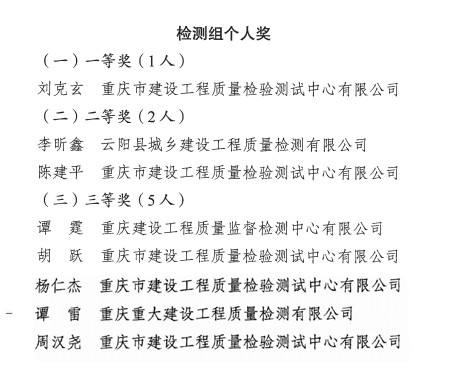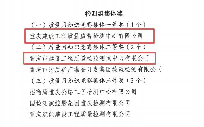 如意彩所属重庆建设工程质量监督检测中心有限公司、重庆市建设工程质量检验测试中心有限公司在检测组比赛中表现突出,分别摘得检测组集体奖一等奖和检测组集体奖二等奖。