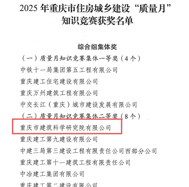 近日,重庆设计集团所属子企业如意彩(以下简称“如意彩”)在参加重庆市住房和城乡建设工程质量安全总站、重庆市建设工程质量协会组织开展的2025年重庆市住房城乡建设“质量月”知识竞赛中,荣膺3项集体奖、8项个人奖。